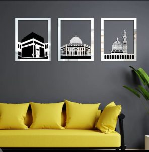 Set Of 3 Masjid Al-Haram - Masjid Al-Aqsa & Masjid An-Nabawi Wall Decor Wall Sticker Muslim Acrylic Mirror Wooden Room Decor (Silver)
