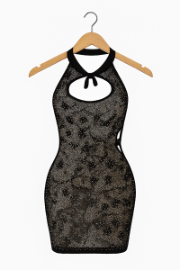 Sheer Glitter Halter Mini Dress ? Keyhole Front, Open Back, Body Stocking Style (Black, Free Size)