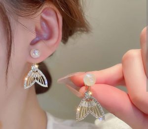 Golden Fishtail Luxury Sparkling Crystal Rhinestones Pearl Earrings for Women Girls