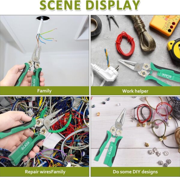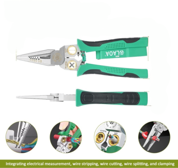 Description8-in-1 Wire Stripper & Voltage Tester ? Multi-Purpose Electrical Tool for ProfessionalsUpgrade your toolkit with this versatile Wire Stripper with Built-In Voltage Tester, engineered for precision, safety, and convenience. Whether you’re a professional electrician or a DIY enthusiast, this dual-function tool simplifies your workflow by combining wire stripping, cutting, and voltage detection in one ergonomic design. With durable construction and intuitive features, it’s the perfect companion for electrical installations, repairs, and maintenance.Key Features2-in-1 FunctionalityCombines wire stripping and voltage testing for efficient electrical work.Precision Cutting BladesSharp, durable edges for clean wire cuts without fraying.Built-In Voltage TesterInstantly detects live wires to ensure safe handling.Ergonomic GripNon-slip, textured handles reduce hand fatigue and improve control.Multi-Gauge CompatibilityStrips wires of various sizes for flexible use across projects.Safety IndicatorsClear polarity symbols (+/?) and voltage markings for quick reference.Compact & LightweightEasy to carry and store, ideal for on-the-go professionals