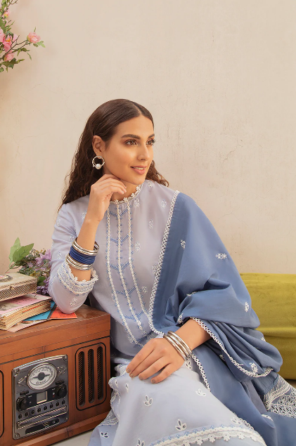 UNSTITCH 3PC: SHIRT DYED EMBROIDERED LAWN FRONT & SLEEVES, PASTE PRINTED BACK,1 EMBROIDERED NECKLINE TROUSERS DYED CAMBRIC TROUSER,80 EMBROIDERED BORDER FOR, DUPATTA PALLU DUPATTA EMBROIDERED LAWN DUPATTA
