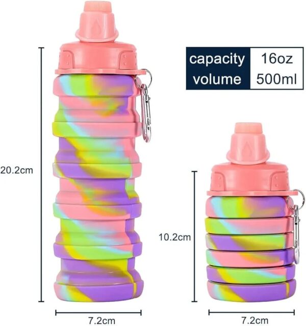 1. The modern and stylish Silicone bottle With a subtle modern and elegant looks. Foldable water bottle can reserve 500ml liquid with only 198g in weight. It can be folded from 9.8 inches to 5.5 inches in height. Collapsible and lightweight design makes you 50% easier to place, portable and storage, The attached Snap hook will hang the bottle with your bag, cycle, waist.