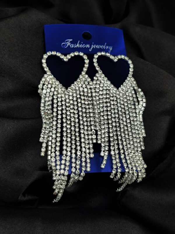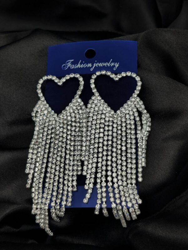 Elevate your look with these stunning heart-shaped long earrings adorned with sparkling rhinestones and a flowing fringe design. Expertly crafted and tarnish-free, these earrings ensure lasting brilliance and durability. Perfect for parties, weddings, or any glamorous occasion, they add a touch of elegance and charm to your ensemble. A must-have accessory to make a bold style statement!