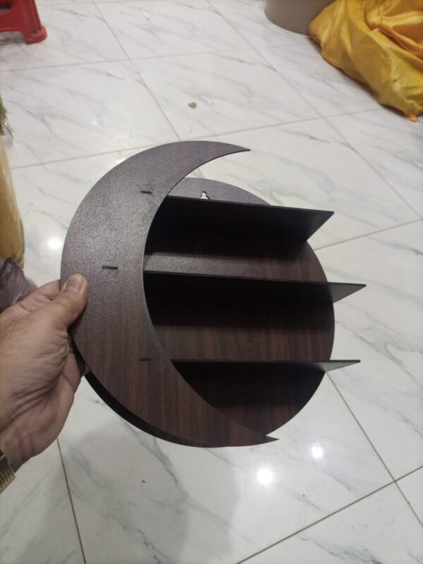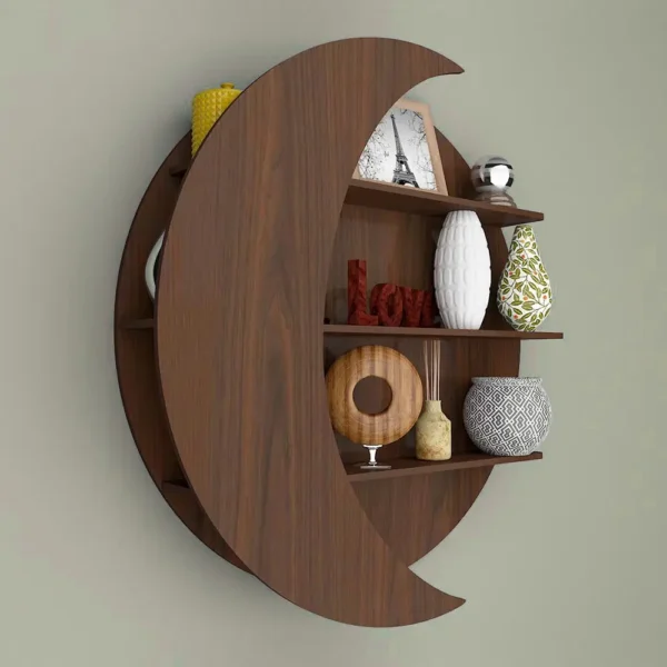Moon Shape Designer Wooden Wall Shelf / Book Shelf, Walnut Finish