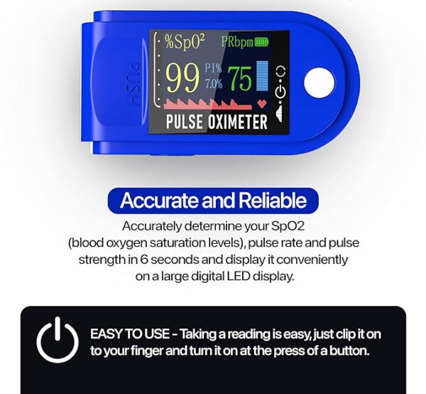 Accurate and Fast: This oxygen monitor can accurately determine your SpO2 (blood oxygen saturation levels), heart rate and pulse strength in 8 seconds and display it conveniently on a large digital LED displaySport Enthusiasts: Suitable for mountain climbers, skiers, bikers, aviators or anyone interested in measuring their SpO2 and pulse rate while on the move. You should only use the pulse ox before or after your exercise. Also, you must remain stationary while the pulse oximeter measure your pulse rate and SpO2 levels. This device is for sports and aviation use onlyWide Rang of Applocations & Long Battery Life: This blood oxygen finger meter light and compact, accommodates wide range of finger sizes,low power consumption long battery life, automatic power off after 16 secondsClear and Easy to Read: This blood and oxygen monitor have LED display, you can read in high light clearly.Our finger oxygen sensor will check and display in real time SpO2, PR, Pulse bar graph which are very easy to understand