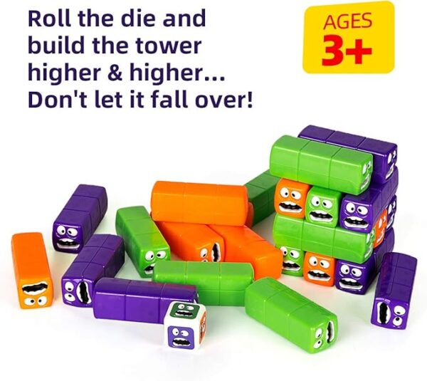 ROLL THE DIE TO DECIDE which color to pull; last to take a turn without toppling the tower wins!