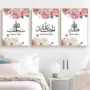 Pack Of 03 - Islamic Canvas Wall Art Pink Peony Canvas Painting Islamic Poster Prints Black and White Islamic