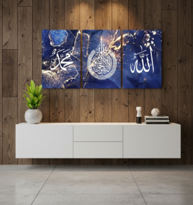 Elegant 3-Piece Islamic Wall Art With Blue And Gold Background Featuring ?Allah?, ?Muhammad? And Arabic Calligraphy, Comes With Double Tape For Easy Wall Mounting.